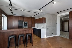 Пеналы: шпон ясеня. Нижние шкафы и остров: крашеный МДФ с покрытием Экоцемент